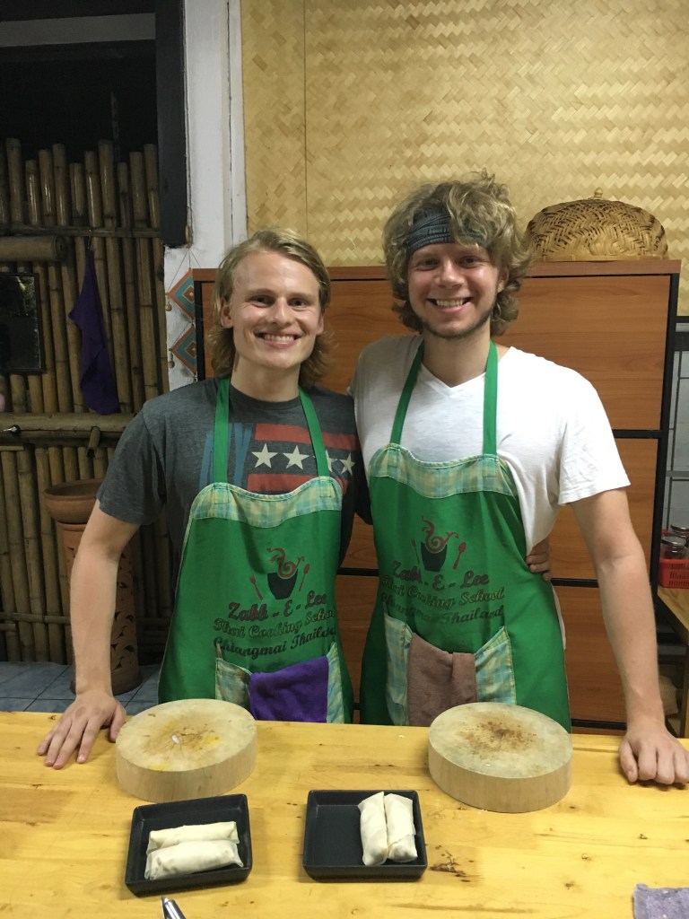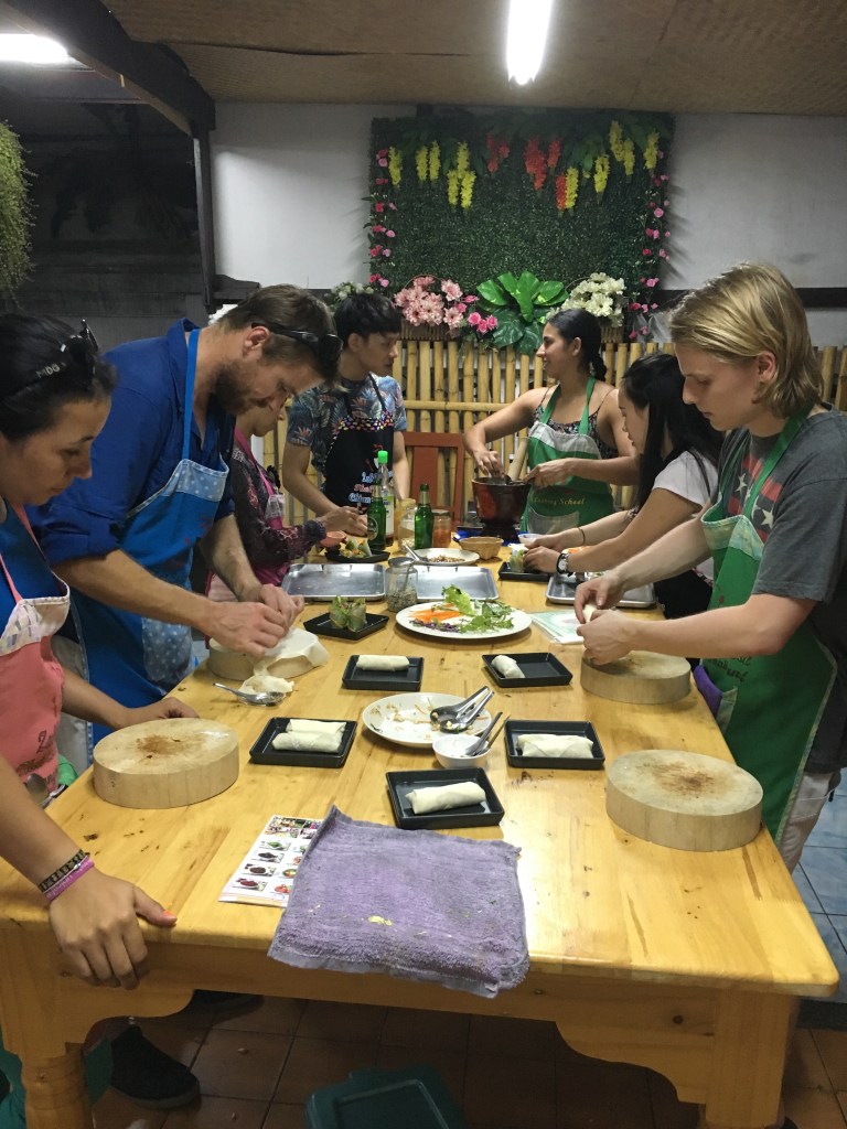 As we finished the prep work it became time to make the various dishes that would make up our meal. First up for us to make was the spring rolls. We took our rice paper and placed it in water and removed it after 10 seconds. We each added the filling we wanted for our spring roll and then we wrapped it up like you would a burrito. Not too difficult, right? We then prepared our curry and soup. For my massaman curry I added my ingredients together in a pot with oil and sautéed. Then I stirred in some coconut milk and let it simmer before finally adding fish sauce and some final ingredients and let it cook for a few more minutes. Our soups involved boiling water and letting our ingredients mix inside the pot to make a delicious, bubbling creation. All of this was done under Tim’s watchful eye, who instructed us through the entire process.